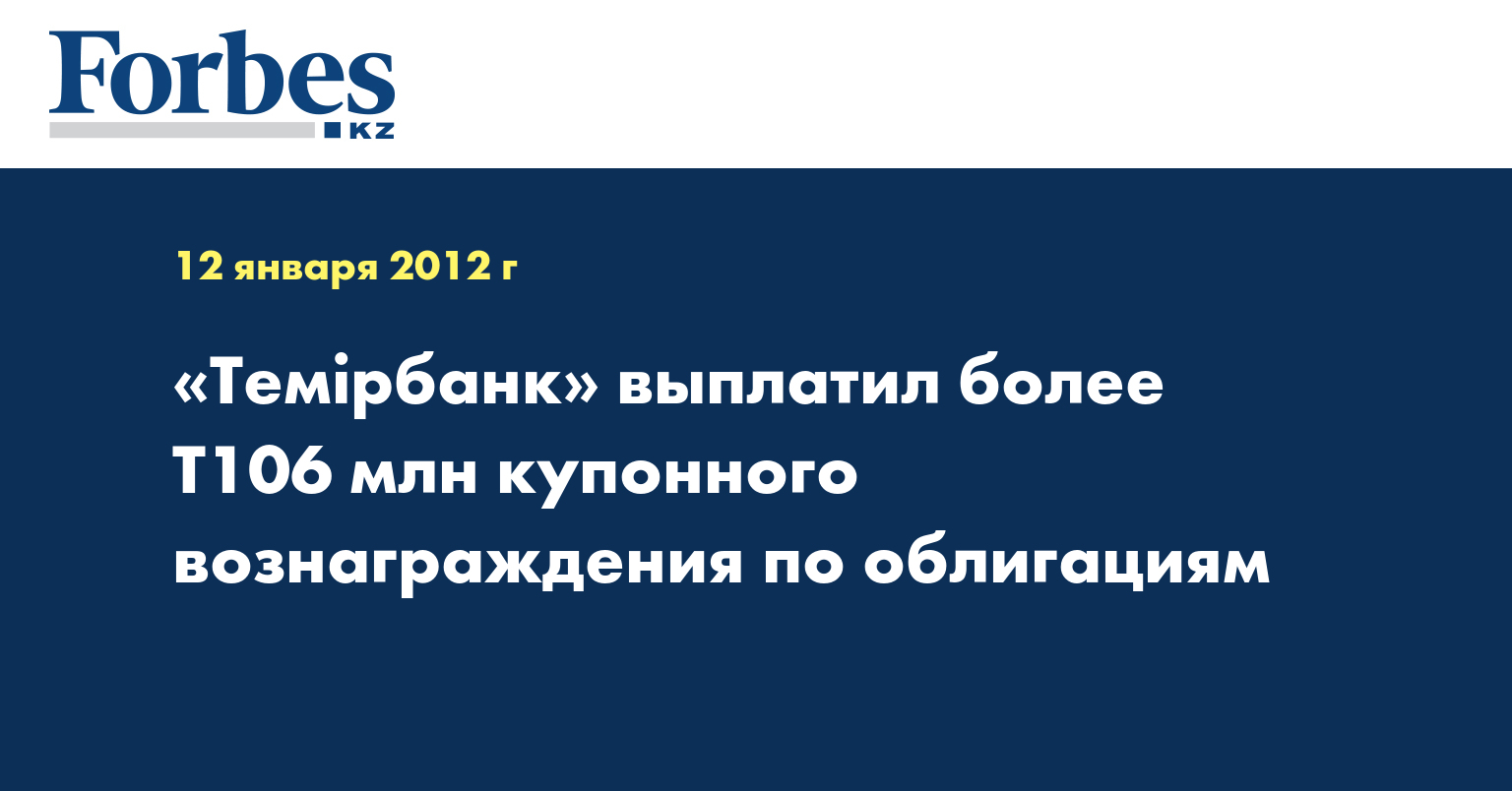 «9 января 2012 года АО «Темiрбанк» осуществило выплату купонного вознаграждения по третьему выпуску облигаций в пределах первой облигационной программы банка… в размере 106 152 744 тенге 15 тиын», - указывается в информации, распространенной в среду, передает КазТАГ.