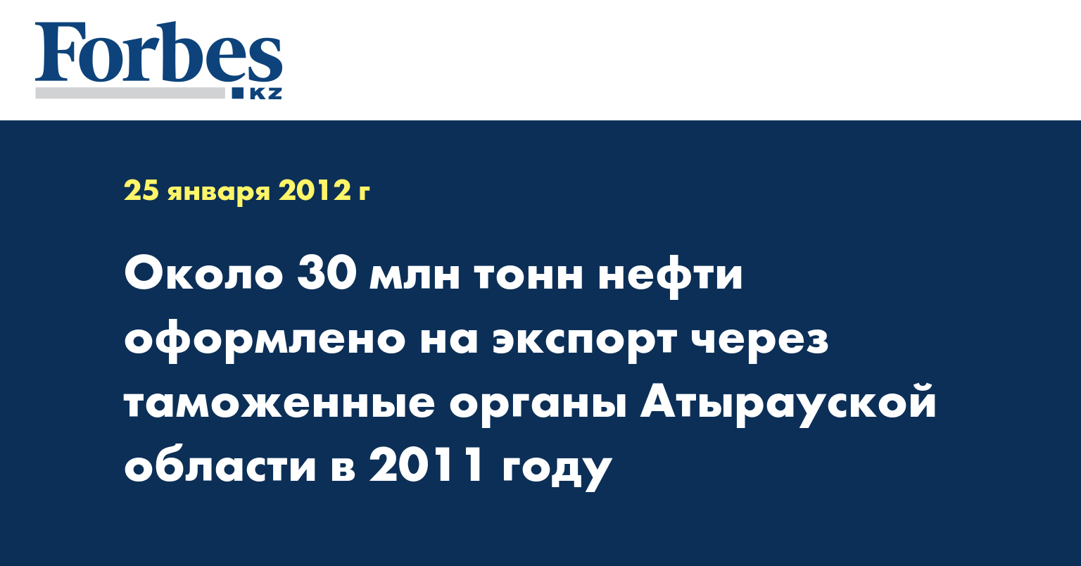 За 2011 год через таможенные органы Атырауской области оформлено на экспорт около 30 млн тонн нефти, сообщил главный специалист таможенного поста «Энергетический» департамента таможенного контроля по Атырауской области Асылбек Докесов, передает КазТАГ.