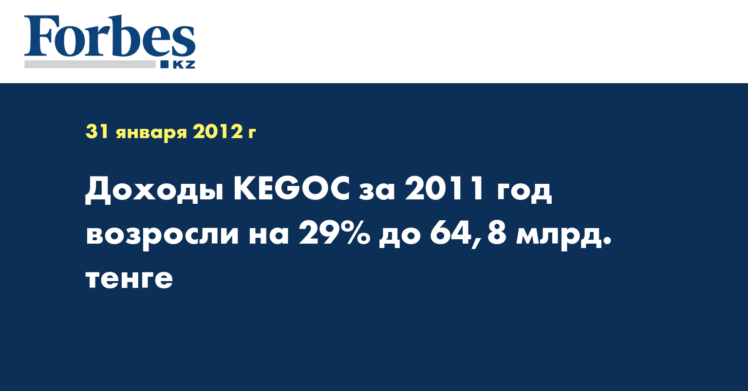 Доходы казахстанской компании по управлению электрическими сетями АО «KEGOC» за 2011 год выросли на 29% до 64,8 миллиардов тенге, сообщает ИА Новости-Казахстан со ссылкой на пресс-службу компании.