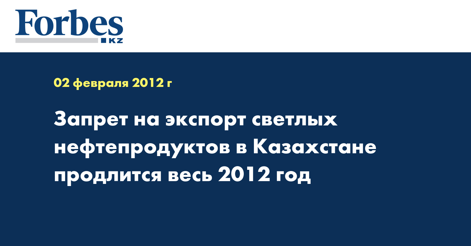 "На 2012 год будет запрет на экспорт светлых нефтепродуктов в течение всего года",- сказал Мынбаев, выступая на коллегии министерства в четверг, передает ИА Новости-Казахстан.
