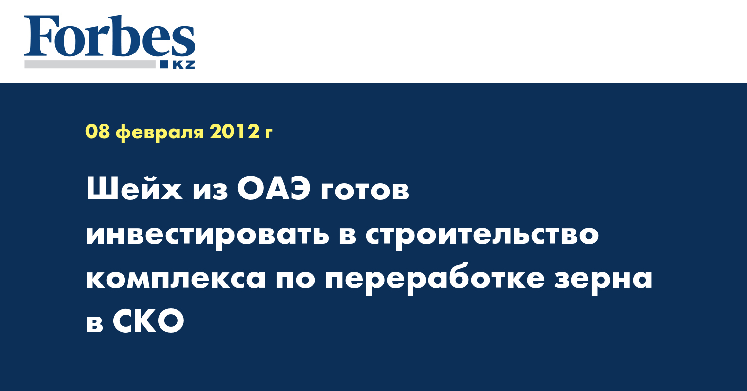 Шейх из Объединенных Арабских Эмиратов (ОАЭ), председатель совета директоров компании Dubai Pearl Абдул Маджид аль-Фахим готов инвестировать в строительство комплекса по переработке зерна в Северо-Казахстанской области (СКО) с емкостью хранилища в 300 тыс. тонн, сообщил корреспондент агентства КазТАГ.