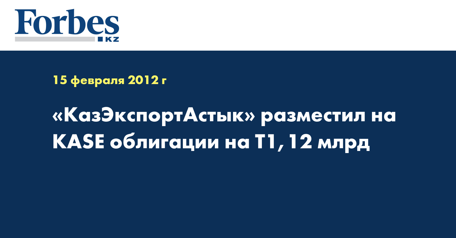 «Сегодня в торговой системе KASE состоялись специализированные торги по размещению облигаций KZ2C0Y05E065 (KZ2C00001634, официальный список KASE, KASTb3; Т1000, Т40 млрд; 18.07.11 - 18.07.16; полугодовой купон 8,5% годовых; 30/360) АО «Холдинг КазЭкспортАстык»», - отмечается в информации, размещенной на сайте KASE во вторник.