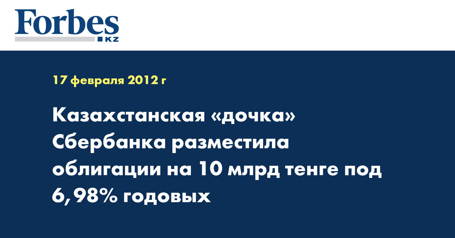 Казахстанская «дочка» Сбербанка России в четверг на специализированных торгах на Казахстанской фондовой бирже (KASE) разместила 7-летние субординированные облигации на 10 миллиардов тенге с доходностью 6,98% годовых, сообщает ИА Новости-Казахстан со ссылкой на пресс-службу банка.