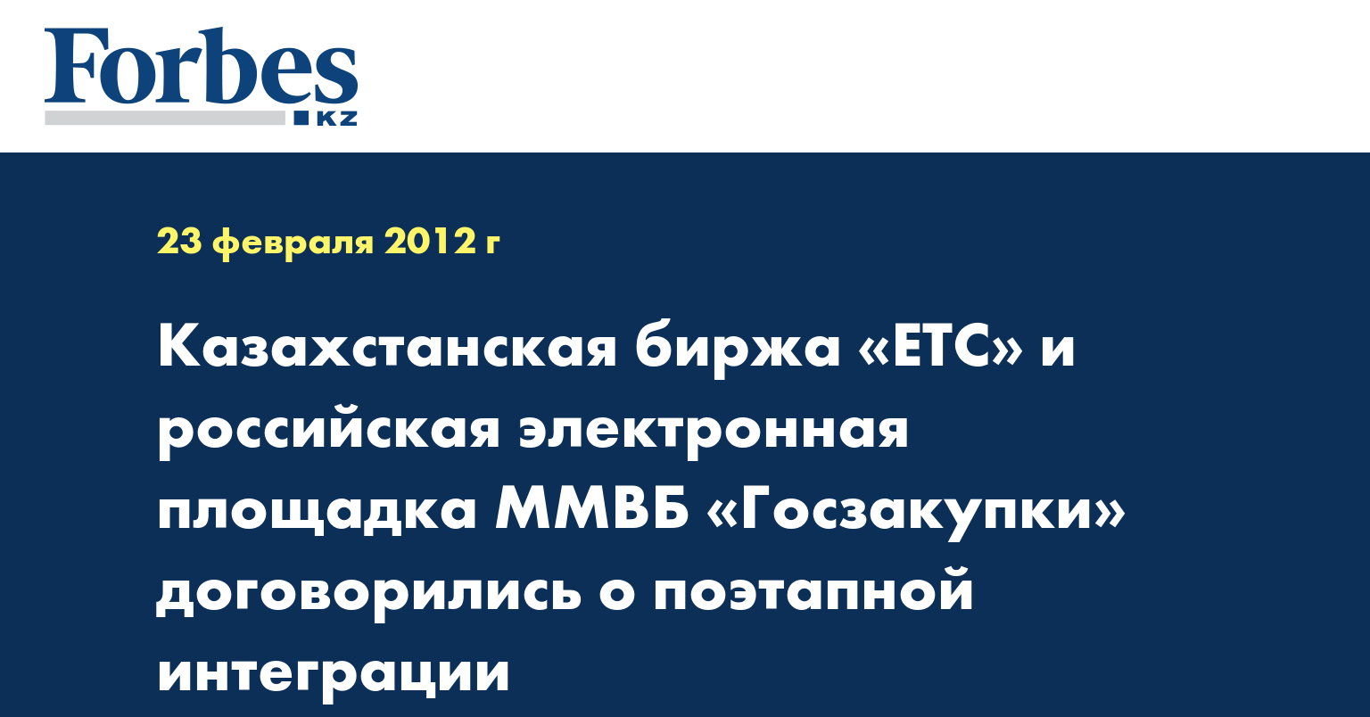 «15 февраля 2012 года врамках создания единого экономического пространства Товарная биржа «ЕТС» и электронная торговая площадка ММВБ «Госзакупки» подписали официальное соглашение о сотрудничестве. Документ был подписан на форуме «Госзаказ-2012» в Москве», - указывается в информации, распространенной в среду.