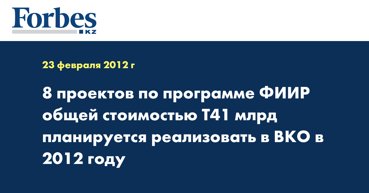 8 проектов по госпрограмме форсированного индустриально-инновационного развития (ФИИР) общей стоимостью Т41 млрд будут реализованы в Восточно-Казахстанской области в 2012 году, сообщил аким региона Бердыбек Сапарбаев, передает КазТАГ.