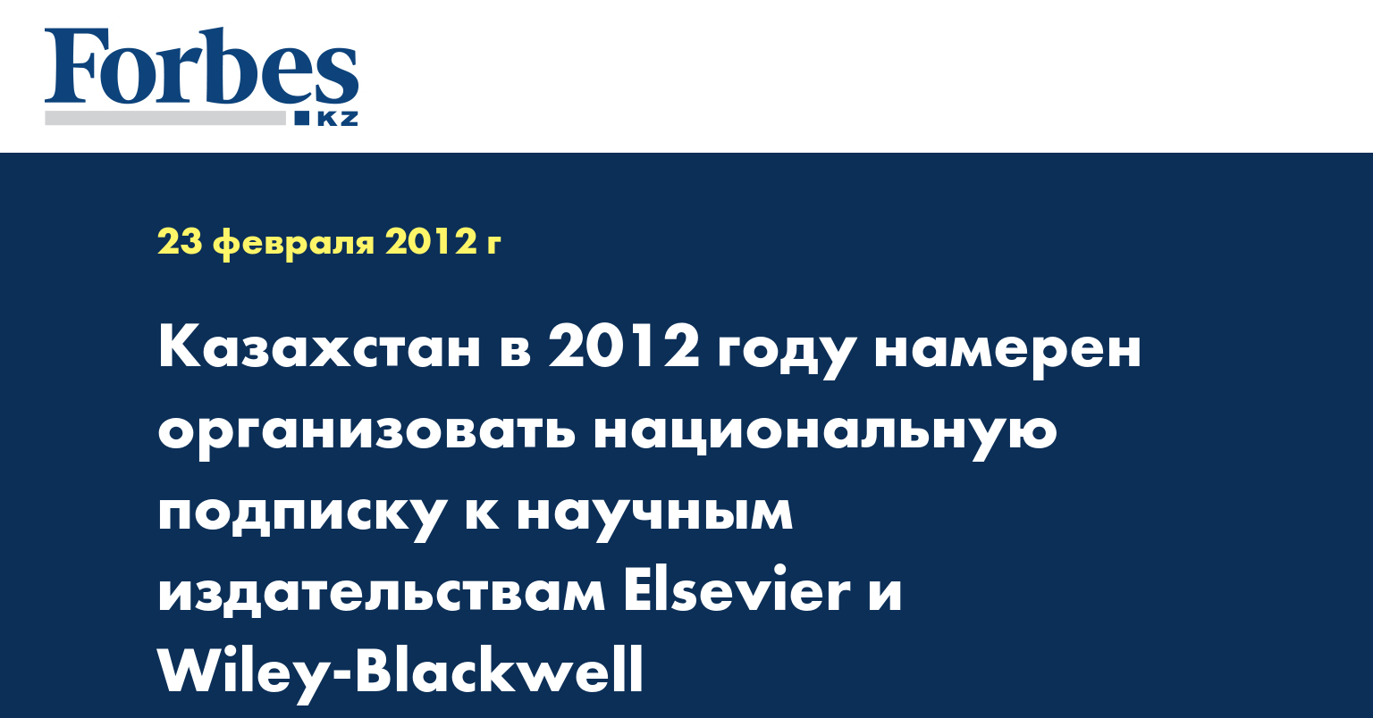 Казахстан в 2012 году планирует проведение работы по организации подписки к двум ведущим научным издательствам Elsevier и Wiley-Blackwell, сообщил вице-министр образования и науки РК Саят Шаяхметов в ходе 9-й Международной Казахстанской выставки «образование и наука XXI века - 2012», передает ИА Новости-Казахстан.