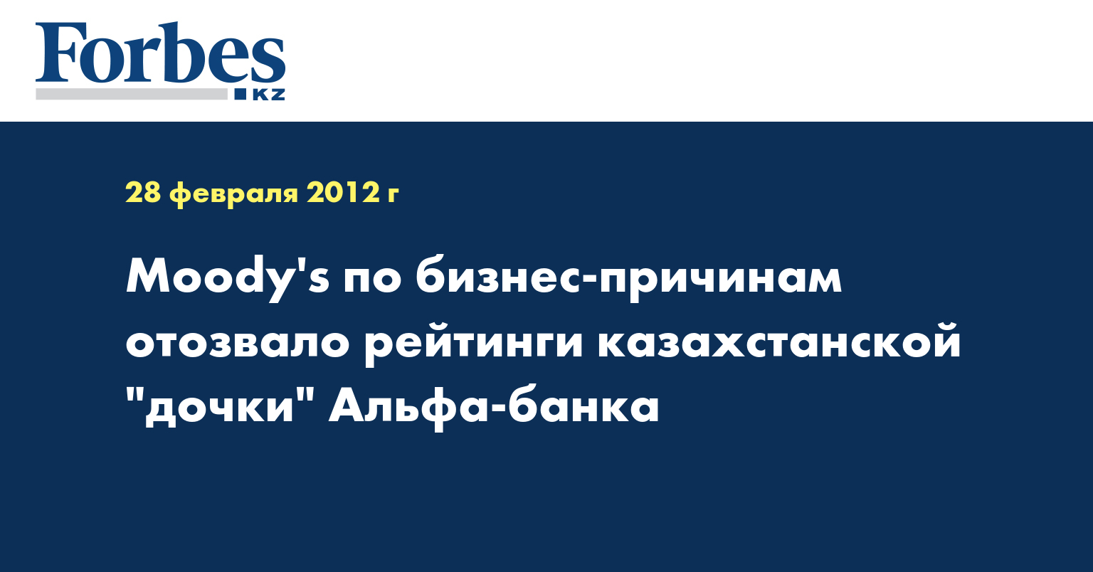 Международное рейтинговое агентство Moody's во вторник отозвало рейтинги АО ДБ "Альфа-банк", казахстанской "дочки" Альфа-банка, крупнейшего российского частного банка, по бизнес-причинам, передает ИА Новости-Казахстан со ссылкой на РИА Новости и сообщение рейтингового агентства.