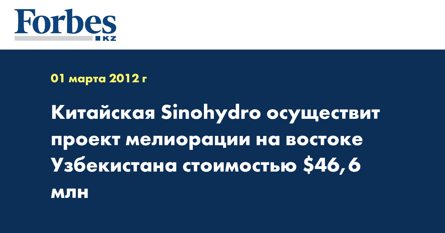 Министерство сельского и водного хозяйства Узбекистана подписало контракт с китайской Sinohydro Corporation на реализацию проекта по улучшению мелиоративного состояния земель в Ферганской долине на востоке Узбекистана стоимостью $46,6 млн, сообщили в минсельводхозе.