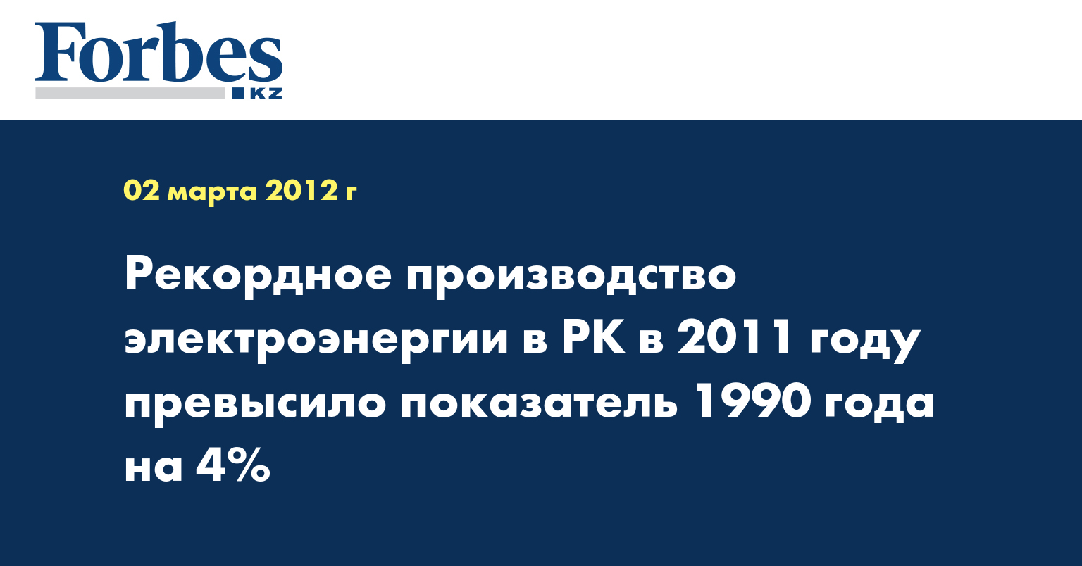 «В 2011 году в Казахстане достигнуто рекордное производство электроэнергии - 86,2 млрд кВт/ч, что превысило на 4% показатель 1990 года Казахской ССР. Максимум нагрузки в 13 387 мегаватт зарегистрирован 21 декабря 2011 года», - отмечается в пресс-релизе.