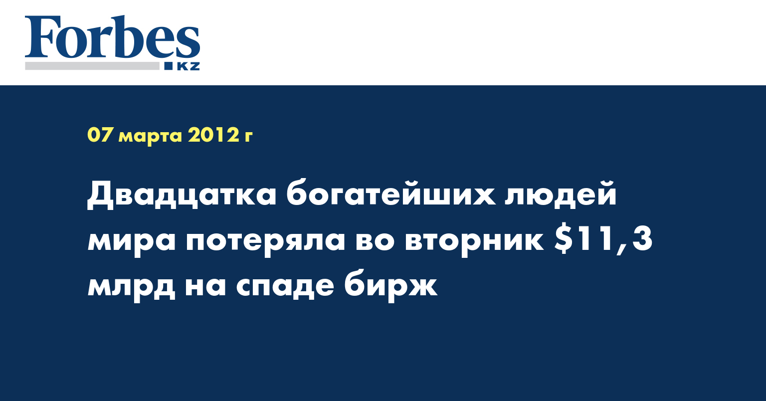 Состояние двадцати богатейших людей планеты во вторник сократилось в совокупности на 11,3 миллиарда долларов на фоне резкого спада на мировых фондовых биржах, произошедшего на фоне слабых статданных в Европе и опасений относительно успеха реструктуризации госдолга Греции, свидетельствуют данные индекса Bloomberg Billionaires Index, передает ИА Новости-Казахстан со ссылкой на РИА Новости.