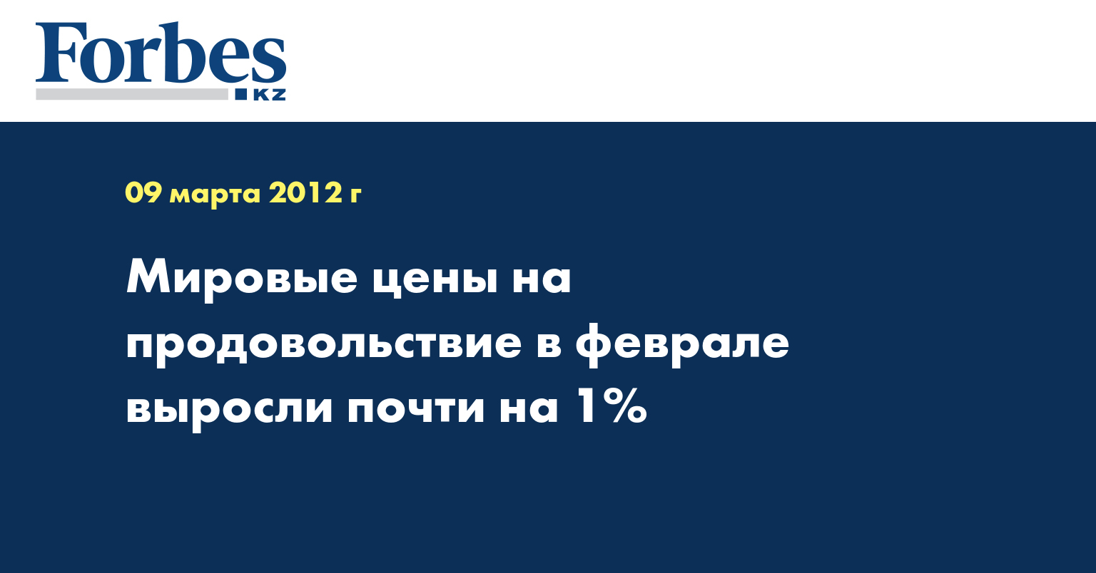 Индекс мировых цен на продовольственные товары (Food Price Index, FFPI) в феврале 2012 года вырос почти на 1% или 2,4 пункта по сравнению с показателем января и составил 215 пунктов, говорится в опубликованном в четверг пресс-релизе Продовольственной и сельскохозяйственной организации ООН (ФАО), передает ИА Новости-Казахстан.