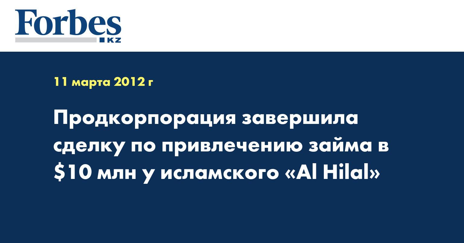 "Одиннадцатого марта состоялась встреча председателя правления АО «НК «Продкорпорация» Бебитхана Кабдрахманова с председателем правления АО «Исламский банк «Al Hilal» Прасадом Абрахамом. По итогам данной встречи было заключено соглашение между Продкорпорацией и исламским банком «Al Hilal» о привлечении займа в размере 10 миллионов долларов США на пополнение оборотных средств", - говорится в распространенном компанией пресс-релизе.