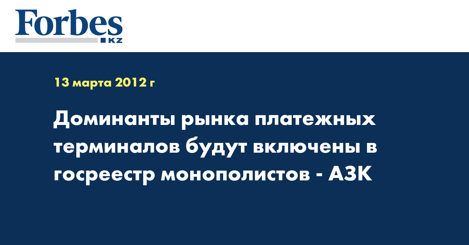 Доминанты рынка платежных терминалов будут включены в государственный реестр субъектов рынка, занимающих доминирующее или монопольное положение, указывается в сообщении агентства РК по защите конкуренции (АЗК), передает КазТАГ.