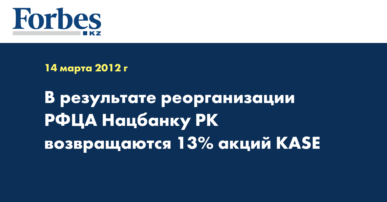 В результате процесса реорганизации АО «Региональный финансовый центр города Алматы» (РФЦА) Национальному банку РК возвращаются 13% акций АО «Казахстанская фондовая биржа» (KASE), сообщил президент биржи Кадыржан Дамитов, передает КазТАГ.