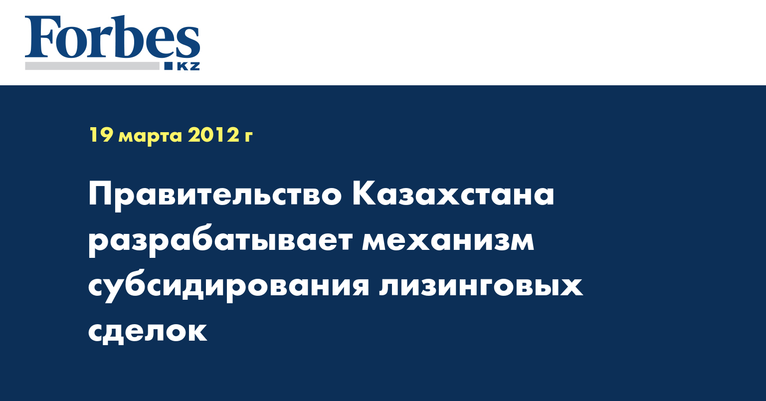 В рамках «Дорожной карты бизнеса-2020» предусматривается введение механизма субсидирования лизинговых сделок, сообщается на официальном сайте премьер-министра Казахстана со ссылкой на директора департамента субсидирования АО «ФРП «Даму» Мираса Бейсембаева, передает ИА Новости-Казахстан.