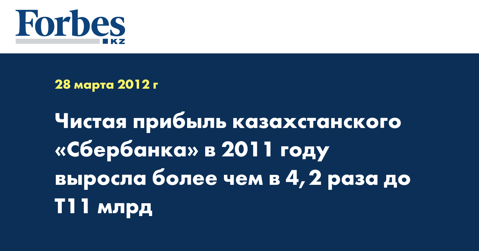 Чистая прибыль казахстанского «Сбербанка», согласно аудированной финансовой отчетности по МСФО, в 2011 году выросла более чем в 4,22 раза, составив Т11 млрд против Т2,6 млрд по итогам 2010 года, указывается в информации на сайте банка, передает КазТАГ.