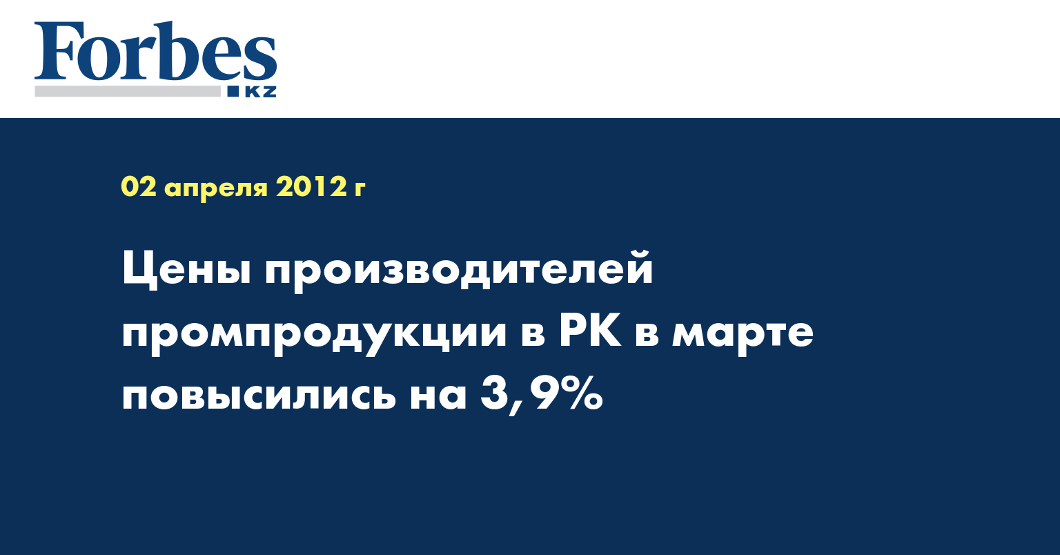 Цены предприятий-производителей промышленной продукции в Казахстане в марте текущего года по сравнению с предыдущим месяцем повысились на 3,9%, указывается в сообщении агентства РК по статистике, передает КазТАГ.