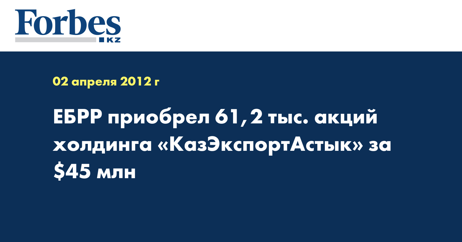 АО «Холдинг «КазЭкспортАстык» официальным письмом уведомило KASE «об осуществлении 28 марта 2012 года сделки по продаже 61 280 простых акций компании (из числа не размещенных) на сумму $45 млн с Европейским банком реконструкции и развития», говорится в сообщении.