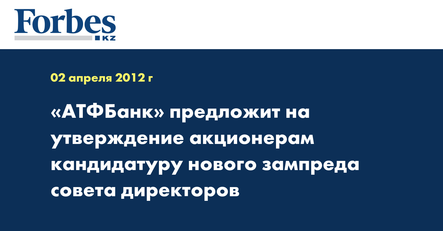 «Совет директоров АО «АТФБанк» 13 марта 2012 года принял решение представить кандидатуру Мухаббат Сеитовой на рассмотрение на годовом общем собрании акционеров АО «АТФБанк», которое состоится 26 апреля в Алматы, в качестве заместителя председателя совета директоров АО «АТФБанк», - указывается в информации, опубликованной на сайте Казахстанской фондовой биржи (KASE) в понедельник.