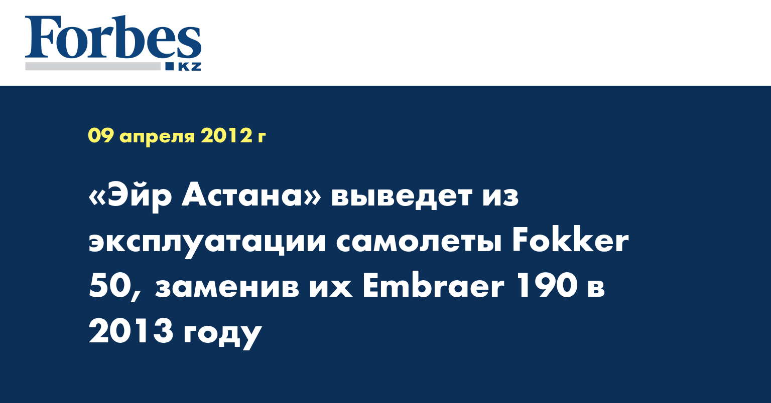 АО «Авиакомпания «Эйр Астана» в 2013 году полностью выведет из эксплуатации самолеты Fokker 50, заменив их Embraer 190, сообщила пресс-служба авиакомпании.