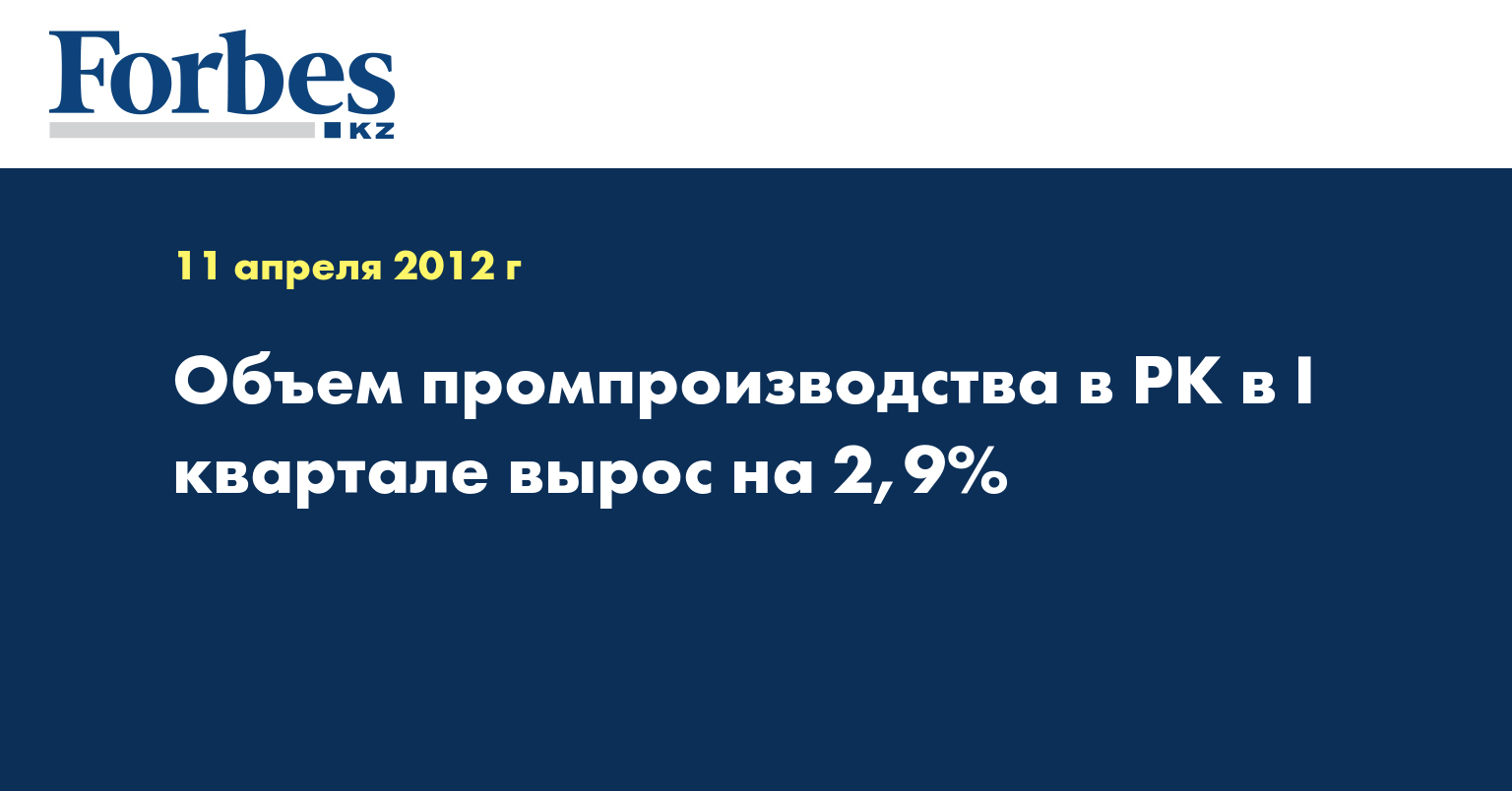 Объем промышленного производства в Казахстане в январе-марте 2012 года вырос на 2,9% по сравнению с аналогичным периодом 2011 года, указывается в сообщении агентства РК по статистике, передает КазТАГ.