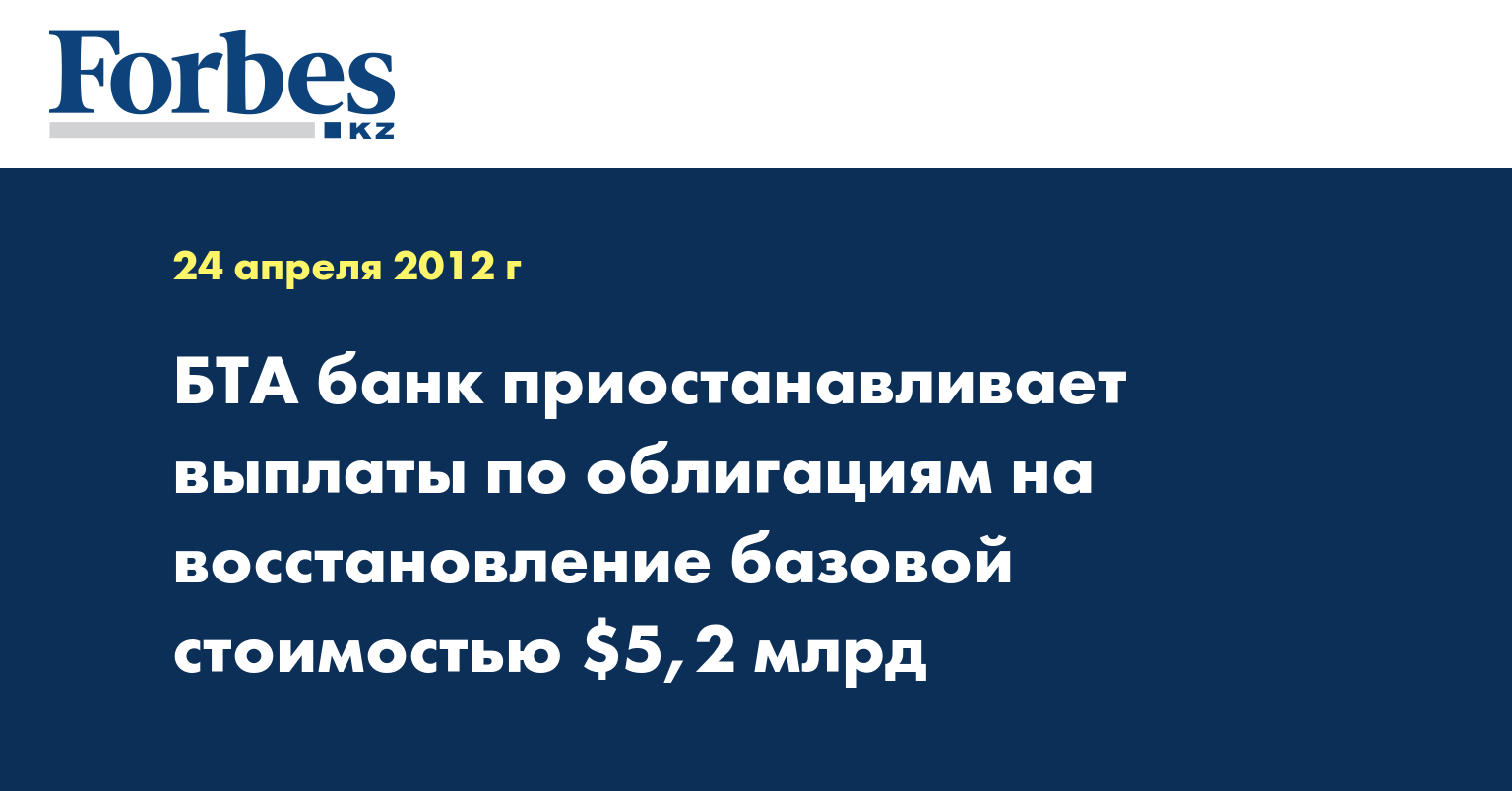 «Сегодня АО «БТА банк» объявляет о приостановлении всех выплат в отношении своих облигаций на восстановление, совокупная первоначальная базовая сумма которых составляет 5 млрд 221 млн 494 тыс. 216 долларов США», - говорится в сообщении, распространенном в понедельник, передает КазТАГ.