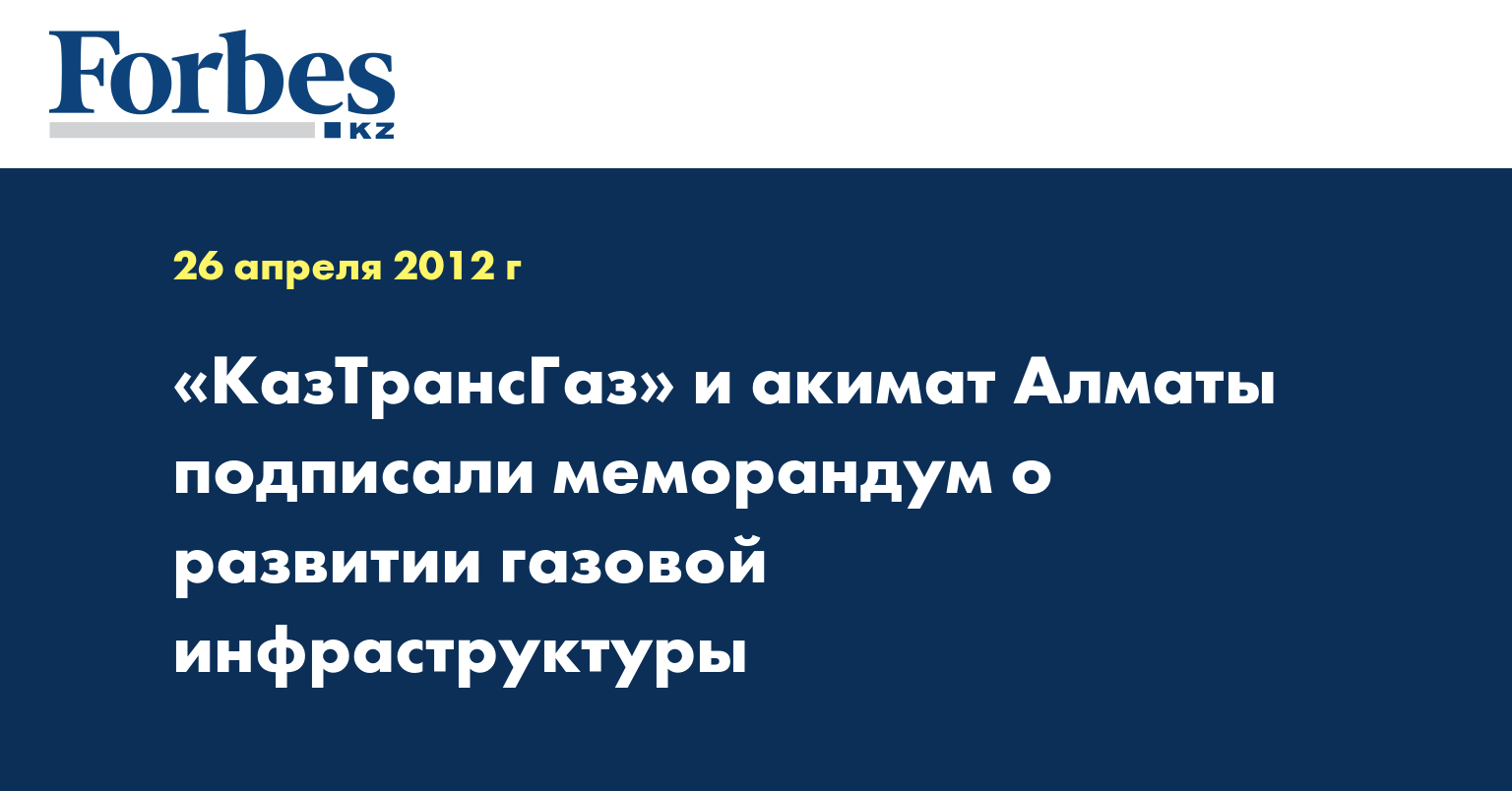 «Сегодня состоялось подписание меморандума о совместных действиях между АО «КазТрансГаз» (дочерняя компания АО «НК «КазМунайГаз») и акиматом Алматы в рамках дальнейшего развития газовой инфраструктуры Алматы и согласно плану мероприятий «Комплексной программы по снижению загрязнения окружающей среды города Алматы на 2009-2018 годы», - указывается в информации, распространенной в четверг.