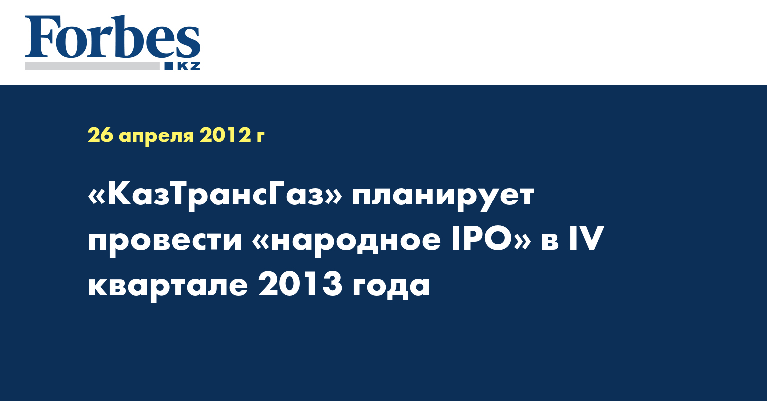 «Компания, честно вам скажу, пока не совсем готова (к проведению «народного IPO» - КазТАГ). Мы хотим делать все это одновременно. Что имеется ввиду? Это реструктуризация «КазТрансГаза» в соответствии с законом о газе и одновременно готовиться к IPO», - сказал он.
