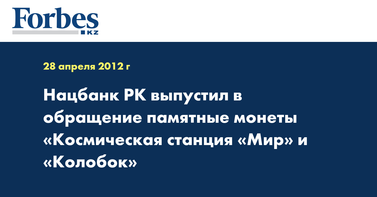 «Национальный банк РК сообщает о выпуске в обращение с 28 апреля 2012 года памятных монет «Космическая станция «Мир» из серии монет «Космос» - биколорную «proof» качества номинальной стоимостью Т500 и из сплава нейзильбер номинальной стоимостью Т50, и памятной серебряной монеты «proof» качества «Колобок» из серии монет «Сказки народов Казахстана» номинальной стоимостью Т500», - указывается в информации, размещенной на сайте Нацбанка в субботу.