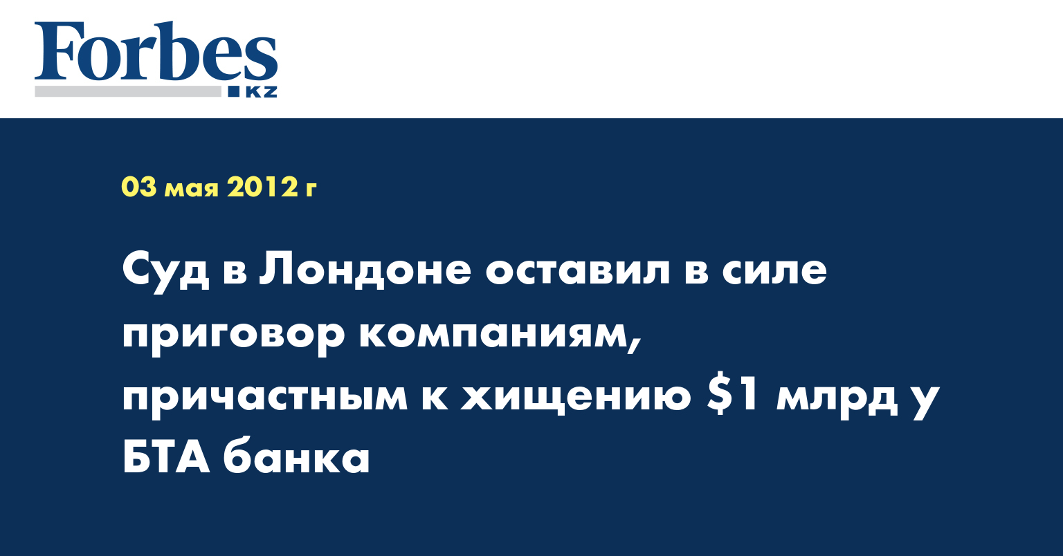 Высокий суд в Лондоне оставил в силе приговор нескольким компаниям, причастным к хищению более $1 млрд у казахстанского БТА банка, сообщило российское агентство правовой и судебной информации (РАПСИ) во вторник.