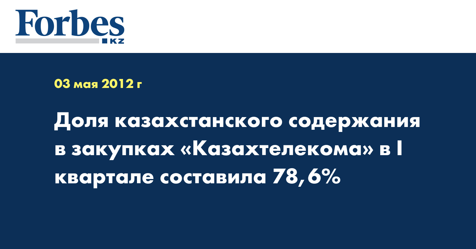 Доля казахстанского содержания в закупках АО «Казахтелеком» по итогам I квартала 2012 года составила 78,6%, указывается в сообщении компании, передает КазТАГ.