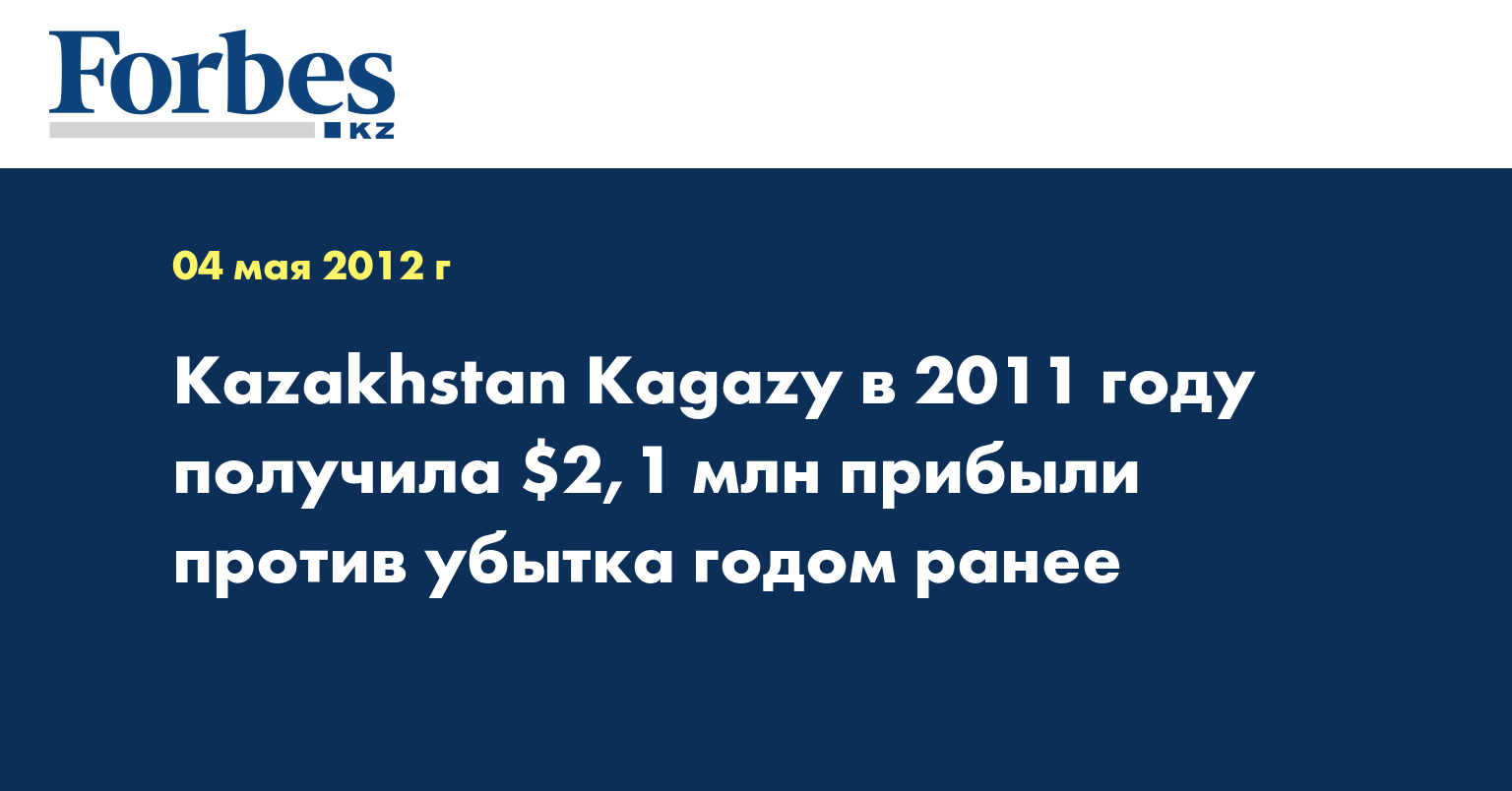 Компания Kazakhstan Kagazy PLC, бумаги которой торгуются на Лондонской фондовой бирже, по итогам 2011 года получила чистую прибыль в размере 2,1 миллиона долларов против чистого убытка в размере 56,8 миллиона долларов в 2010 году, сообщила пресс-служба компании со ссылкой на аудированную консолидированную отчетность по МСФО.