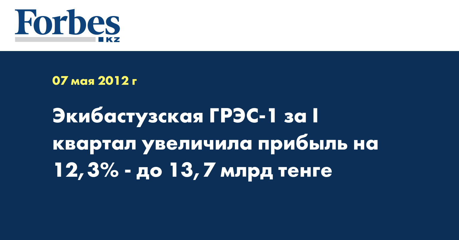 ТОО «Экибастузская ГРЭС-1» в январе-марте 2012 года получило чистую прибыль в размере 13,706 миллиарда тенге против прибыли в размере 12,204 миллиарда тенге в аналогичном периоде 2011 года, указывается в отчетности компании, передает ИА Новости-Казахстан.