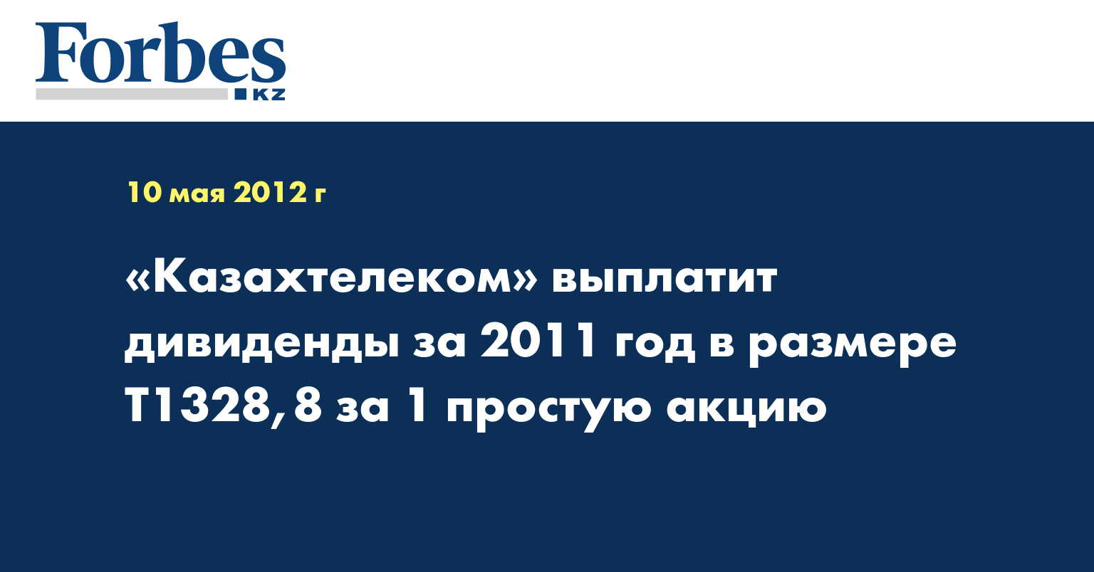 «Утвердить размер дивидендов по итогам 2011 года по простым акциям АО «Казахтелеком» в размере 1328 (одна тысяча триста двадцать восемь) тенге 80 (восемьдесят) тиын на 1 (одну) простую акцию», - отмечается в пресс-релизе.