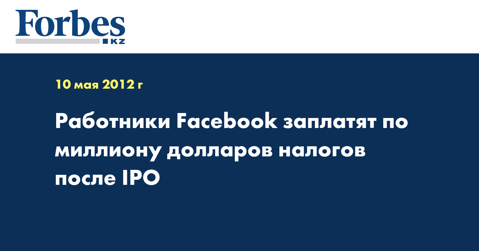 Сотрудники Facebook будут вынуждены заплатить в среднем по миллиону долларов налогов после первичного публичного размещения (IPO) крупнейшей социальной сети в мире. Об этом пишет CNNMoney со ссылкой на данные Facebook, передает Lenta.ru.