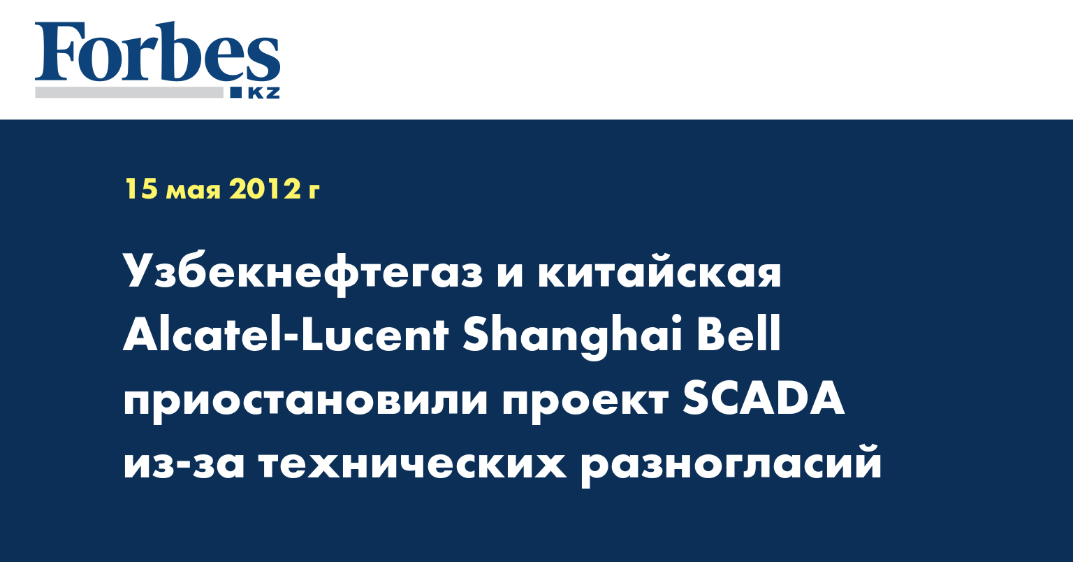 Национальная холдинговая компания НХК «Узбекнефтегаз» и китайская Alcatel-Lucent Shanghai Bell Co. приостановили проект по внедрению системы управления и технологической связи на газотранспортной сети (SCADA) из-за технических разногласий, сообщил журналистам председатель правления «Узбекнефтегаза» Шокир Файзуллаев, передает КазТАГ.