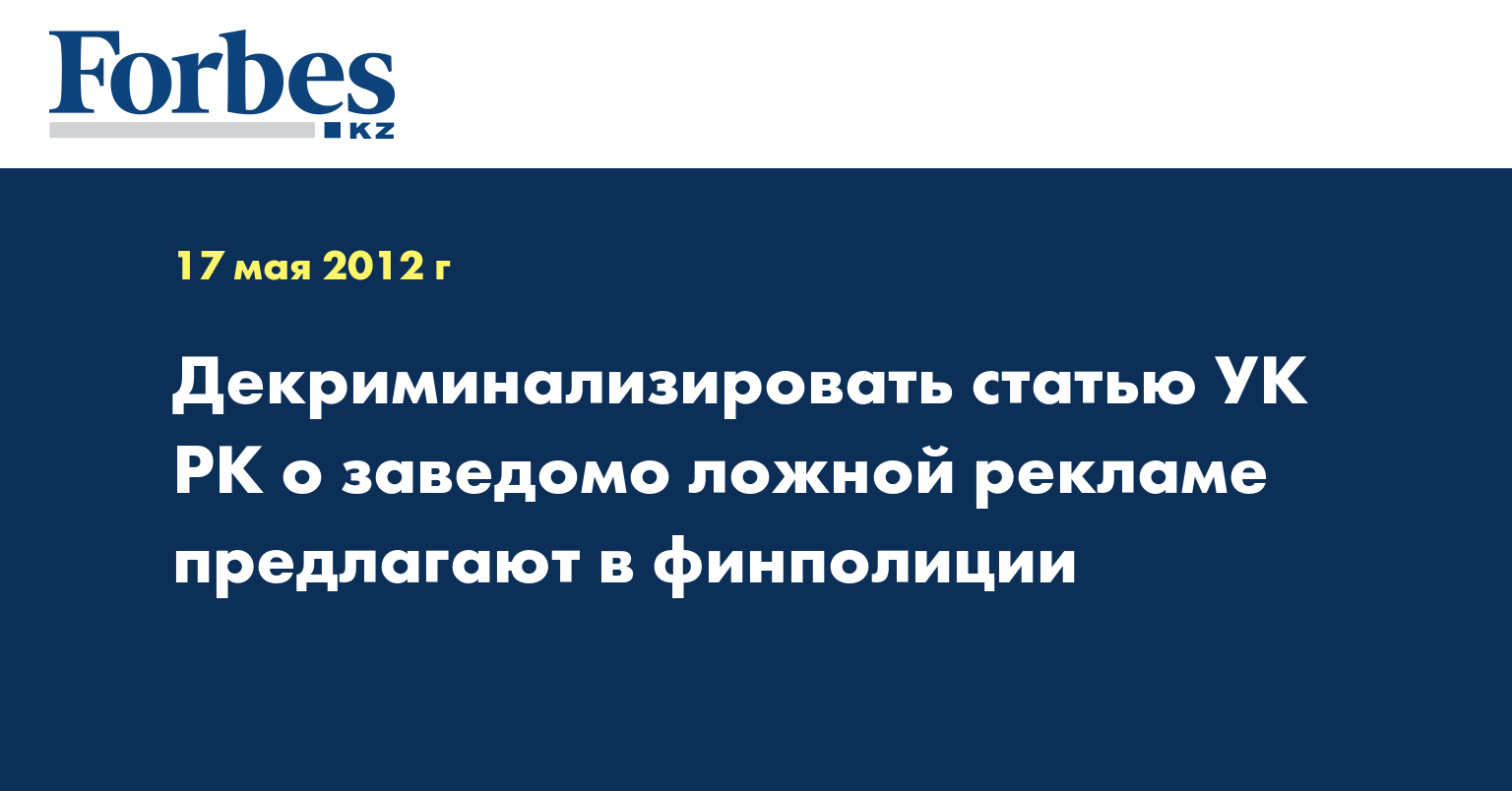 «С учетом анализа предыдущей декриминализации, оперативно-следственной практики агентства (финансовой полиции - КазТАГ) мы предложили полностью декриминализировать статью 198 - это «заведомо ложная реклама», поскольку, по нашему мнению, указанное противоправное деяние не представляет большой общественной опасности, и все эти моменты, связанные с последствиями ложной рекламы, мы предполагаем, можно решить в гражданско-правовом аспекте», - сказал он на конференции «Реформирование налогового администрирования в Республике Казахстан» в четверг.