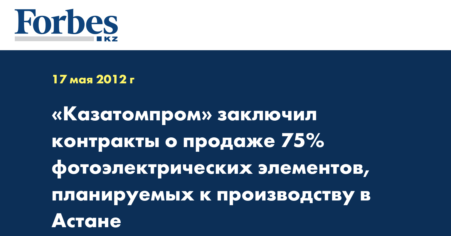 «Мы начали строительство завода в Усть-Каменогорске по производству фревия - серных фотоэлектрических пластин, где будет генерироваться электроэнергия. Строительство этого завода закончится в декабре этого года. Все эти пластины будут поступать на завод уже по производству солнечных панелей, который строится в Астане, на 64 МВт. 75% продукции уже законтрактовано, французские компании готовы покупать наши солнечные батареи», - сказал В.Школьник на заседании совета по экономической политике при фракции НДП «Нур Отан» в мажилисе парламента «О функционировании инновационных кластеров и развитии их инфраструктуры» в четверг.