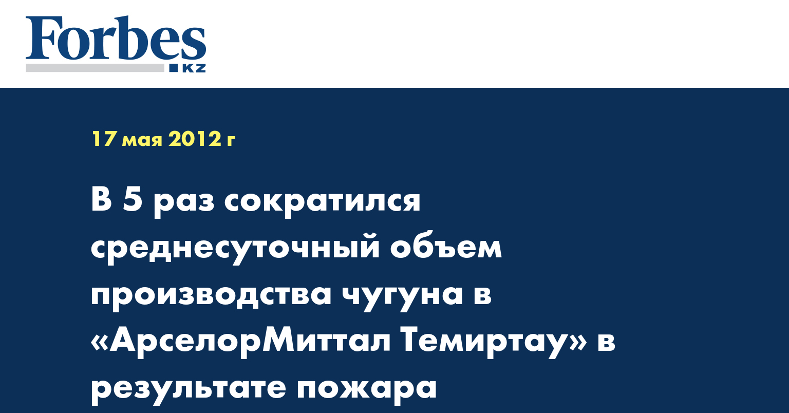 В результате пожара на аглопроизводстве АО «АрселорМиттал Темиртау» производство чугуна сократилось в 5 раз от среднесуточного плана в мае, указывается в сообщении компании, передает КазТАГ.