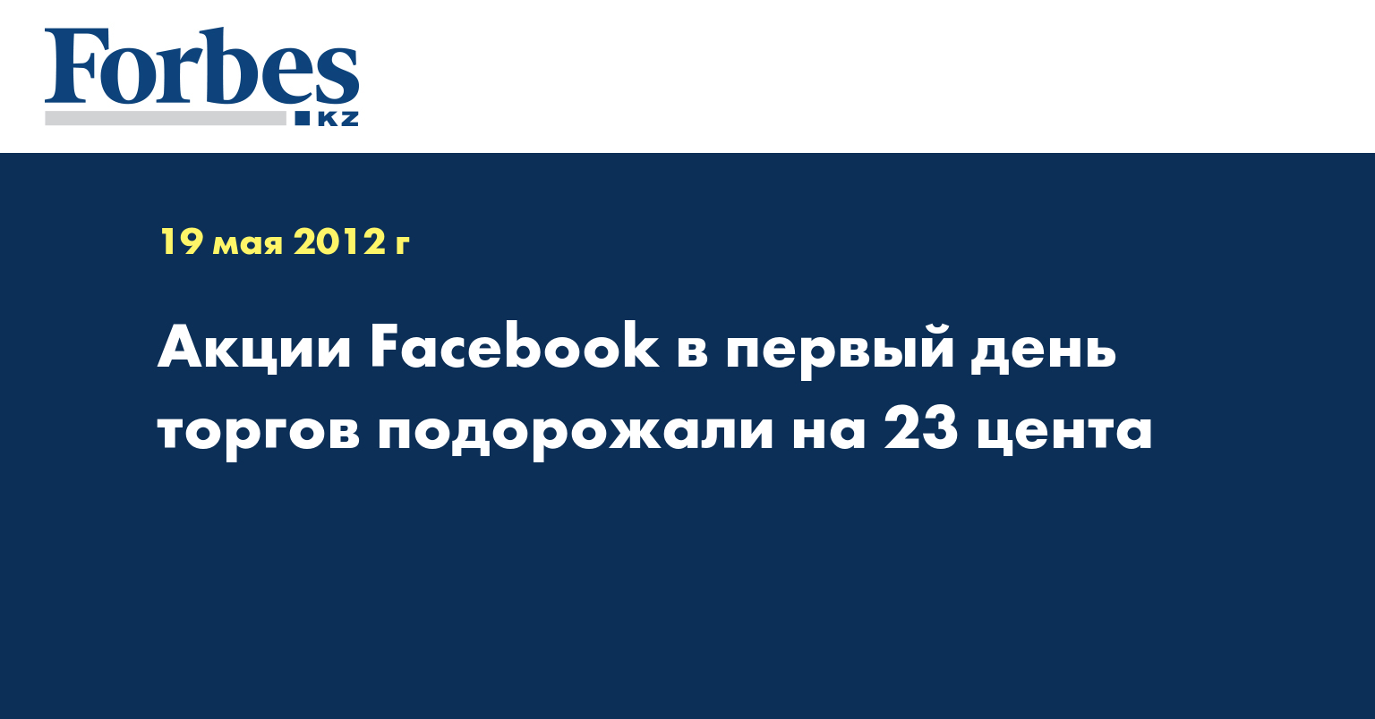 Акции социальной сети Facebook закончили свой первый день торгов на бирже Nasdaq ростом в 23 цента. Как сообщает Lenta.ru со ссылкой на Bloomberg, к закрытию биржи цена одной ценной бумаги составила 38,23 доллара при цене размещения 38 долларов.