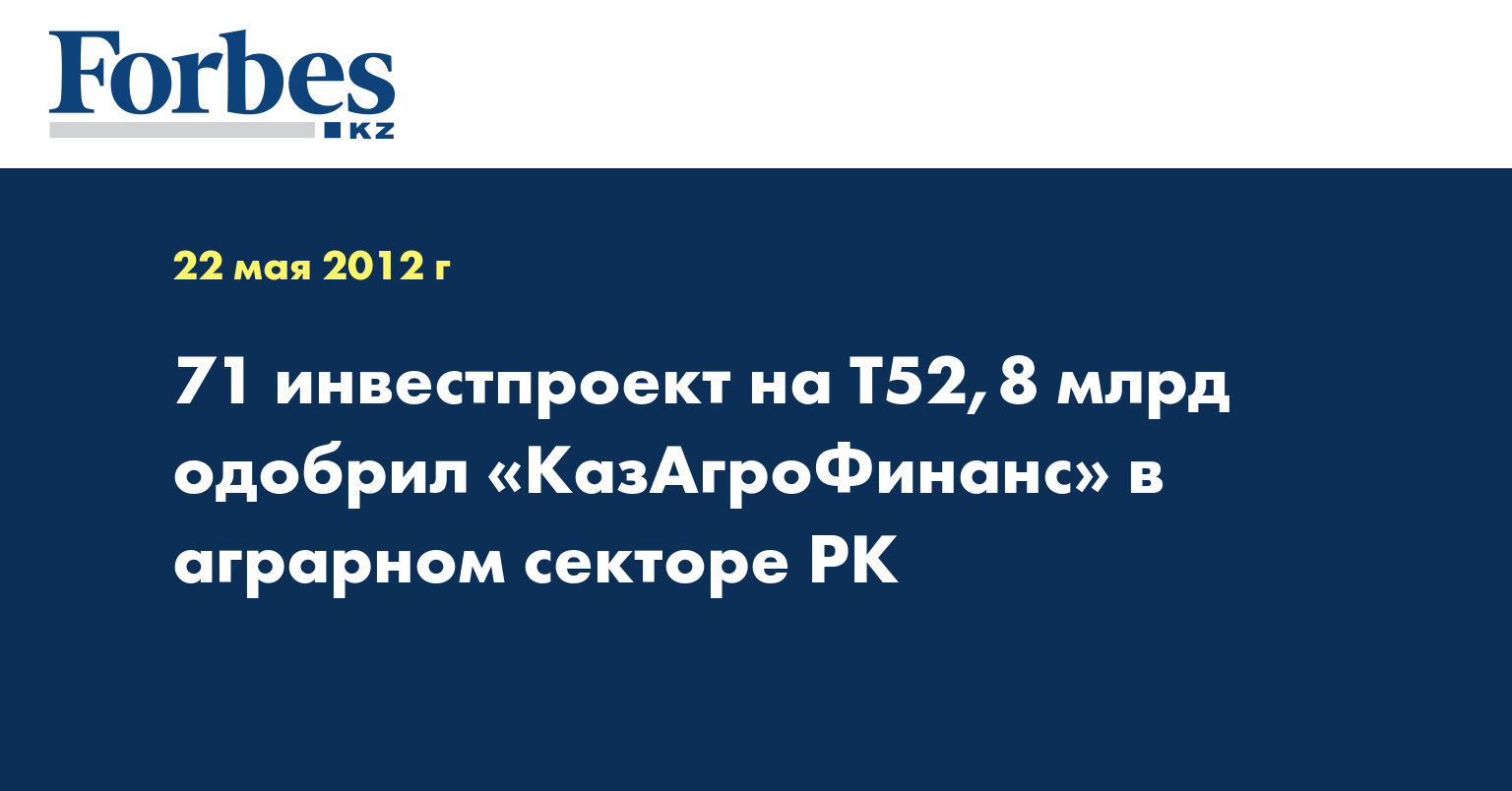 «На сегодня «КазАгроФинанс» в аграрном секторе экономики республики одобрил 71 инвестиционный проект на общую сумму 52,8 млрд тенге», - цитирует пресс-служба Н. Малелова по итогам сессии в рамках V Астанинского экономического форума, передает КазТАГ.