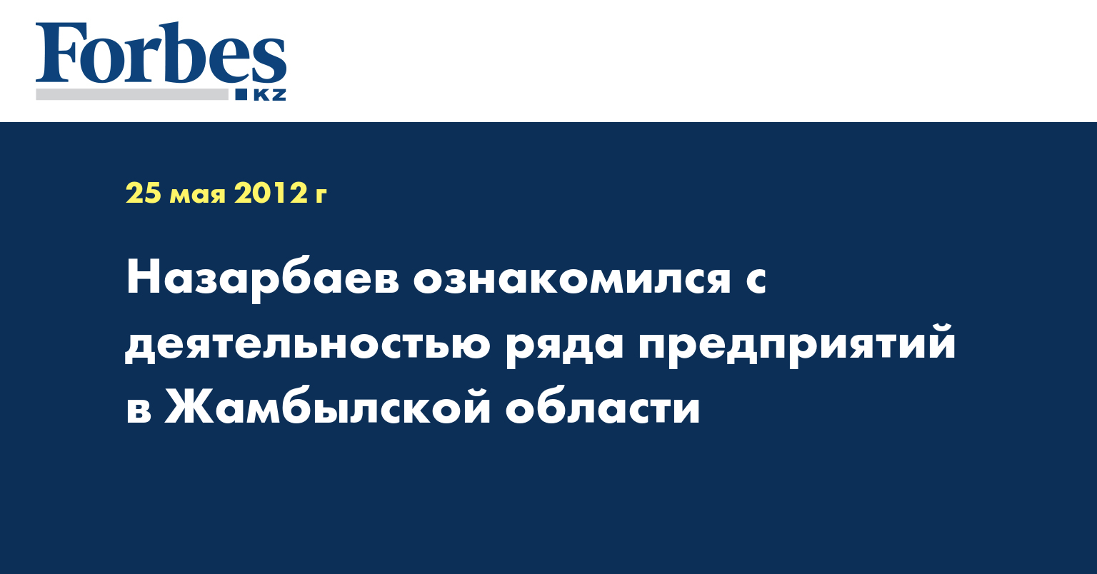 Президент Казахстана Нурсултан Назарбаев в рамках рабочей поездки в Жамбылскую область ознакомился с деятельностью ряда предприятий региона, сообщает корреспондент агентства КазТАГ.