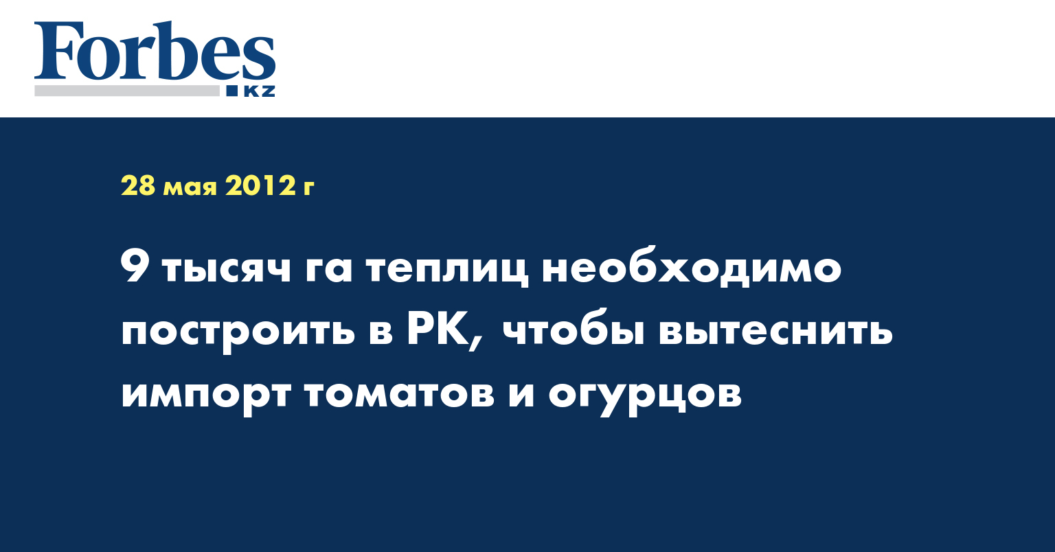 «Общая потребность Казахстана, чтобы заместить все импортные потоки полностью, по нашим расчетам, при условии, что казахстанец… будет иметь хотя бы по 100 граммов салата томатов и огурцов к обеду, потребуется порядка 9 тыс. гектаров современных промышленных теплиц», - сказал он на пресс-конференции в понедельник.