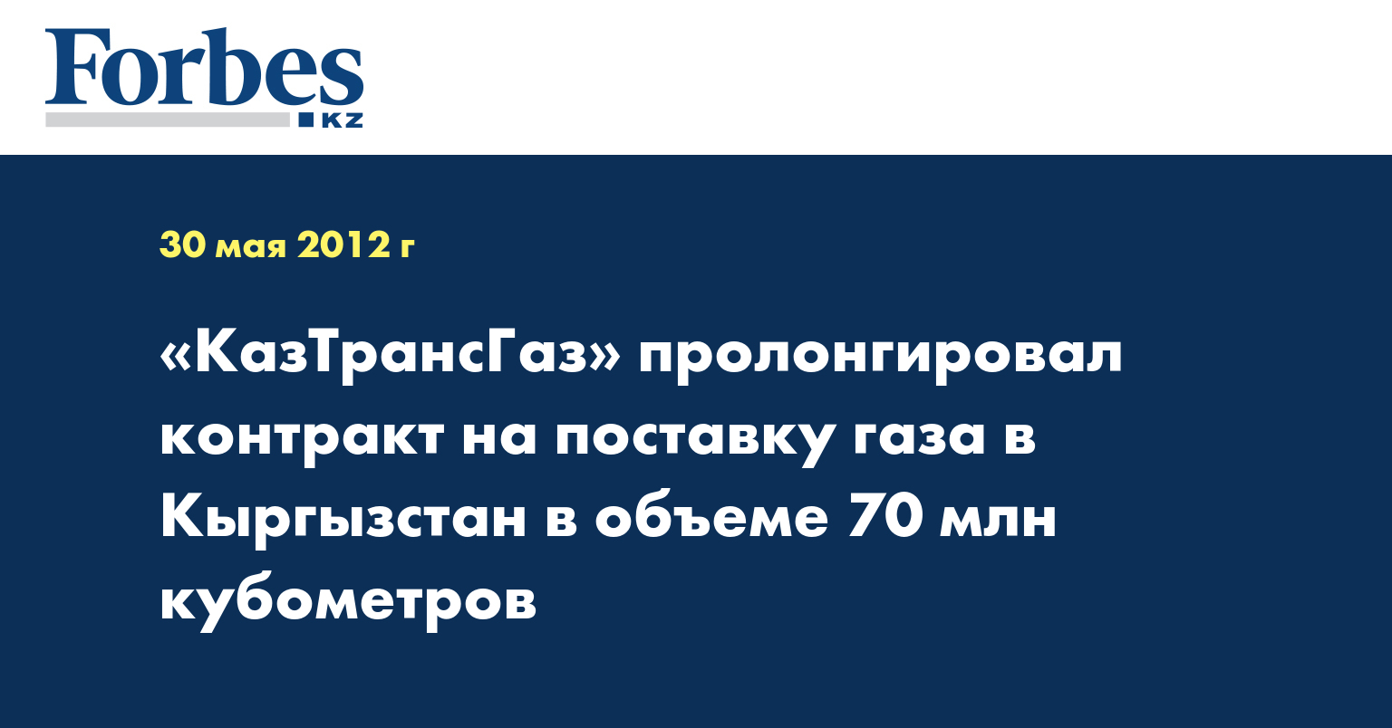 АО «КазТрансГаз» пролонгировало контракт на поставку газа в Кыргызстан в объеме 70 млн куб.м. Об этом КирТАГ сообщил заместитель генерального директора ОАО «Кыргызгаз» Евгений Орленко в среду, передает КазТАГ.
