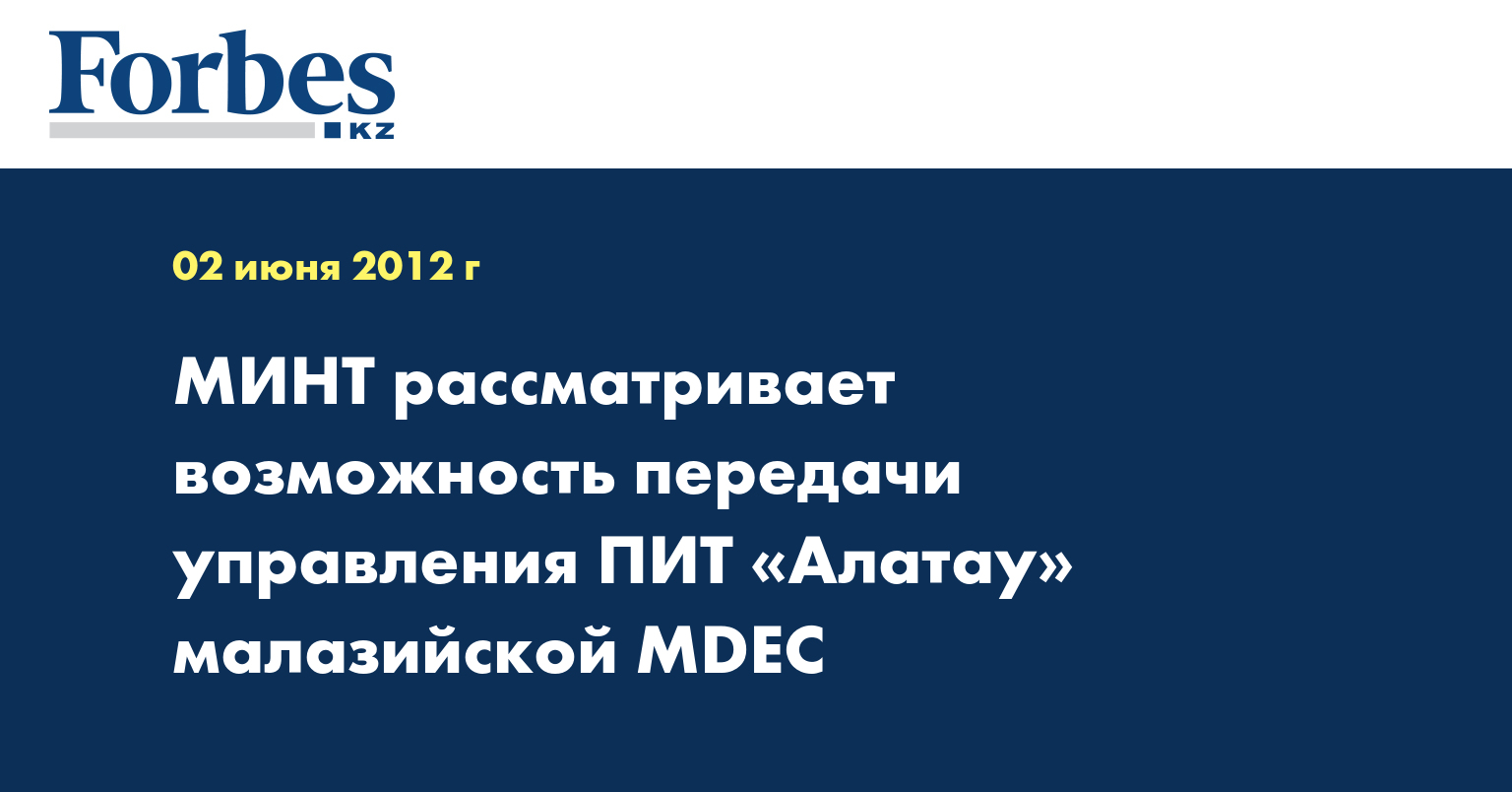 Министерство индустрии и новых технологий (МИНТ) РК рассматривает возможность передачи управления свободной экономической зоны (СЭЗ) парка инновационных технологий (ПИТ) «Алатау» малазийской компании MDEC, сообщил вице-министр ведомства Каныш Тулеушин.