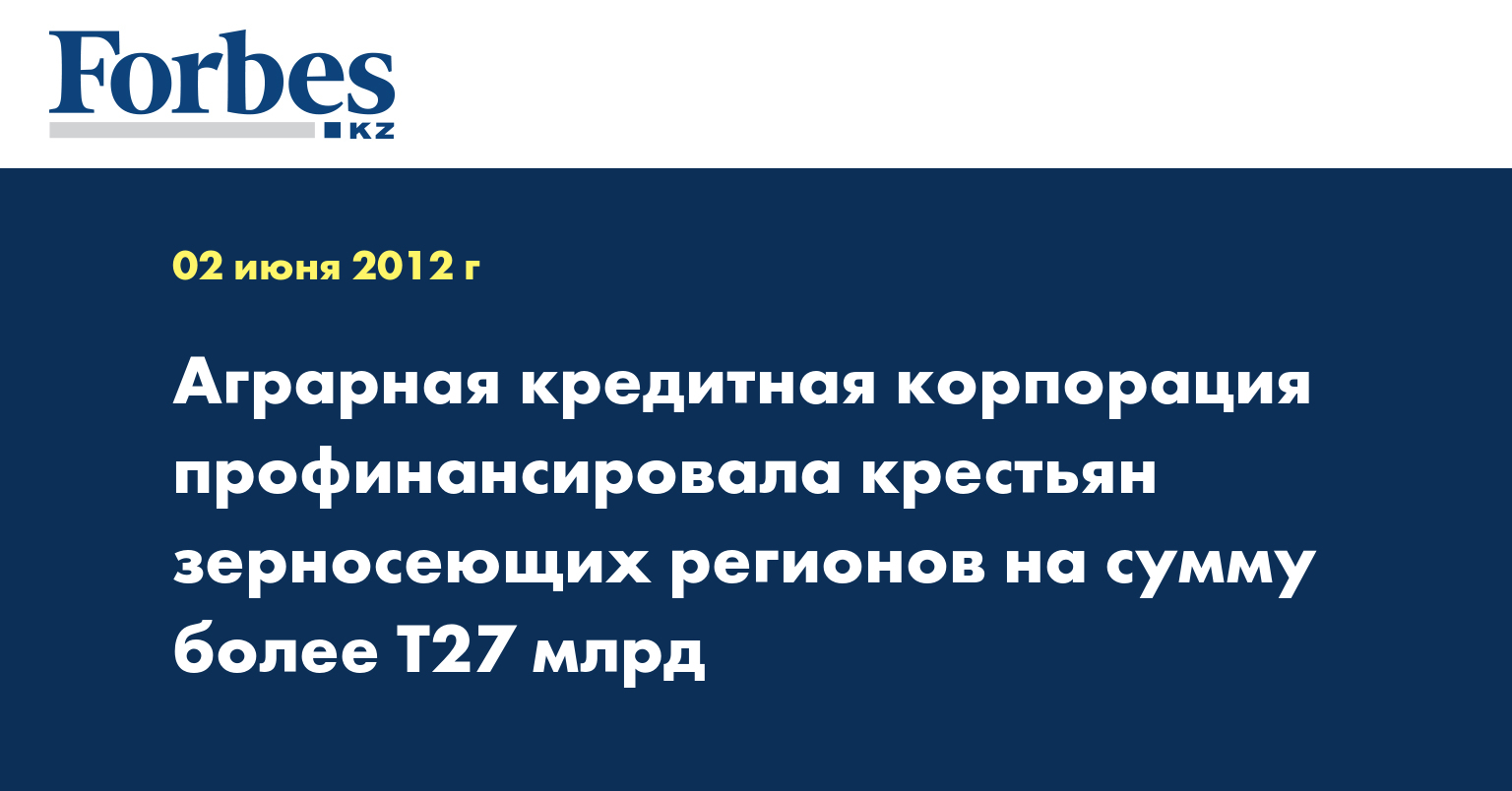 АО «Аграрная кредитная корпорация» профинансировала крестьян зерносеющих регионов на сумму более Т27 млрд, сообщила пресс-служба министерства сельского хозяйства (МСХ) РК, передает КазТАГ.