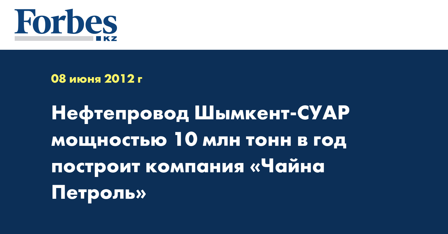 Нефтепровод Шымкент-СУАР мощностью 10 млн тонн в год построит компания «Чайна Петроль Компани «Джунда», сообщил КирТАГ в пятницу.