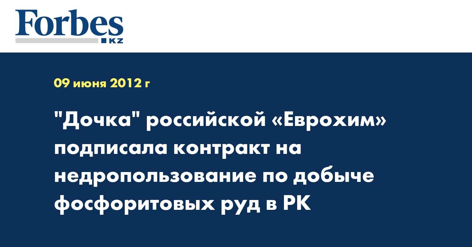 Министерство индустрии и новых технологий Казахстана (МИНТ) подписало с ТОО «ЕвроХим-Удобрения» (дочерняя компания российского ОАО «МХК «Еврохим») контракт на недропользование по добыче фосфоритовых руд в Жамбылской области (юг Казахстана), сообщает управление информации МИНТ.