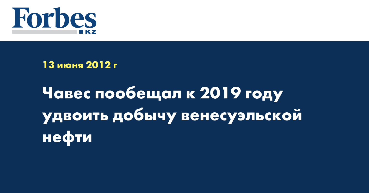 Президент Венесуэлы Уго Чавес пообещал в случае, если его переизберут на президентских выборах в октябре, увеличить к 2019 году добычу нефти в стране более чем в два раза - до шести миллионов баррелей в сутки. Об этом сообщает Lenta.ru со ссылкой Bloomberg.