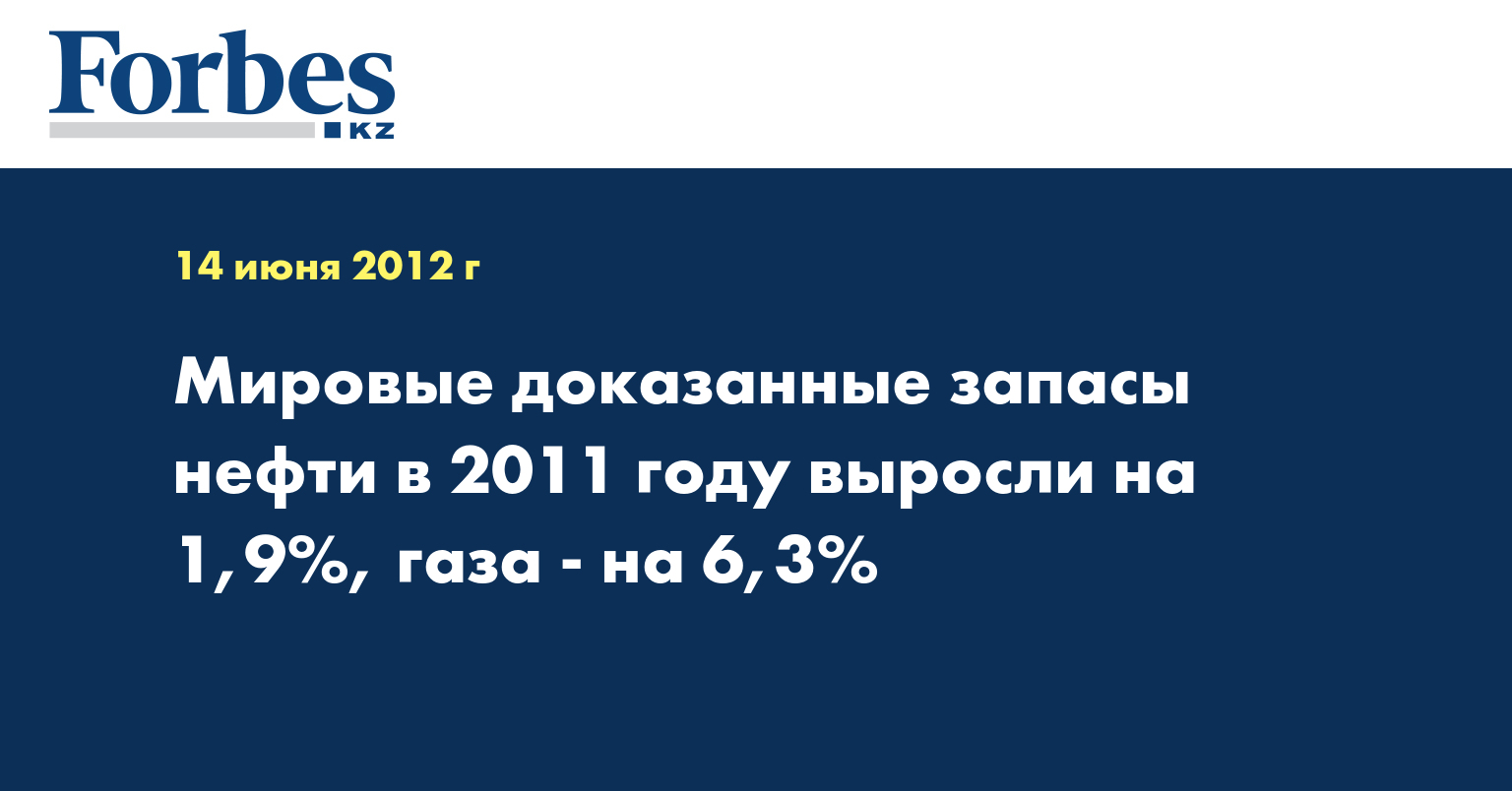Мировые доказанные запасы нефти в 2011 году выросли на 1,9% и составили 1,653 триллиона баррелей (234,3 миллиарда тонн) по сравнению с пересмотренным показателем за предыдущий год в 1,62 триллиона баррелей, сообщила британская нефтегазовая компания BP в своем ежегодном обзоре, передает ИА Новости-Казахстан.